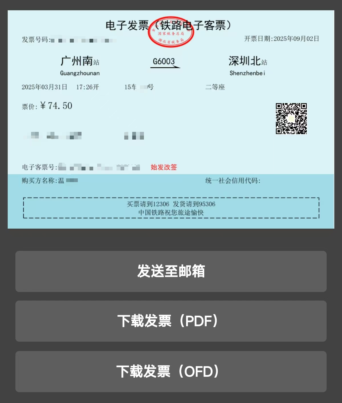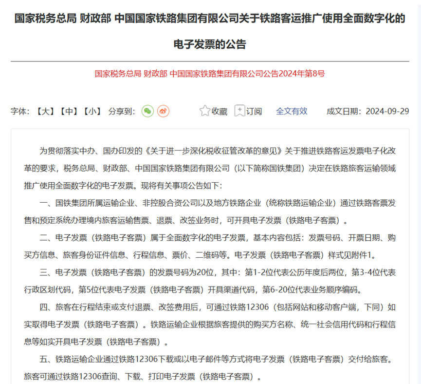 根据国家税务总局、财政部、中国国家铁路集团有限公司公告 2024 年第 8 号规定,2024 年 11 月 1 日起全国铁路全面推广数字化客运电子发票。