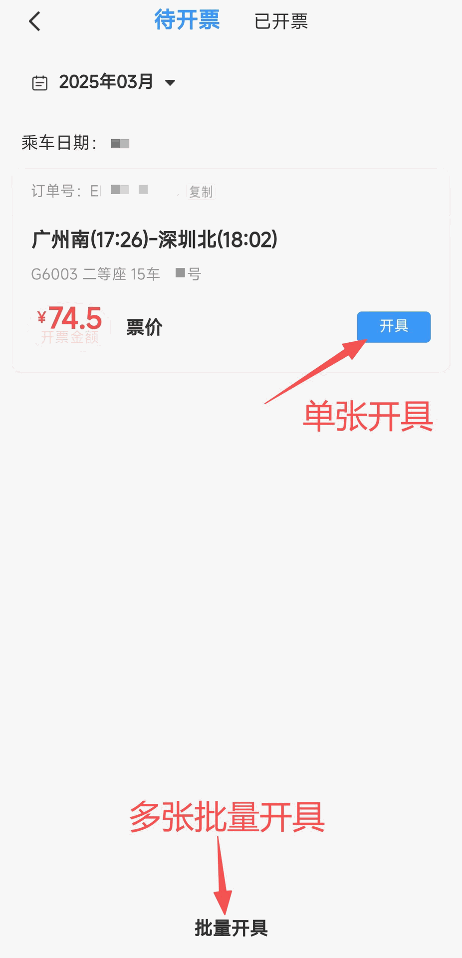 3:点击“开具电子发票”,系统会显示乘车记录,可以单张开票,也可以选择底部的“批量开具”。