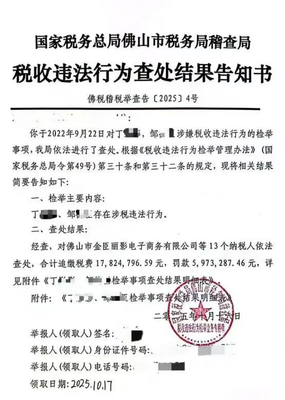 历经 3 年细致调查,广东佛山市税务局稽查局最终查实:“小影夫妇” 及其关联的 13 家公司均存在偷逃税行为。依据相关法律法规,税务部门作出处罚决定:追缴税费 1782 万余元,并处以罚款 597 万余元,总计金额超 2300 万元。目前,相关处罚已全部执行完毕,樊女士也已拿到税务部门出具的查处结果告知书。