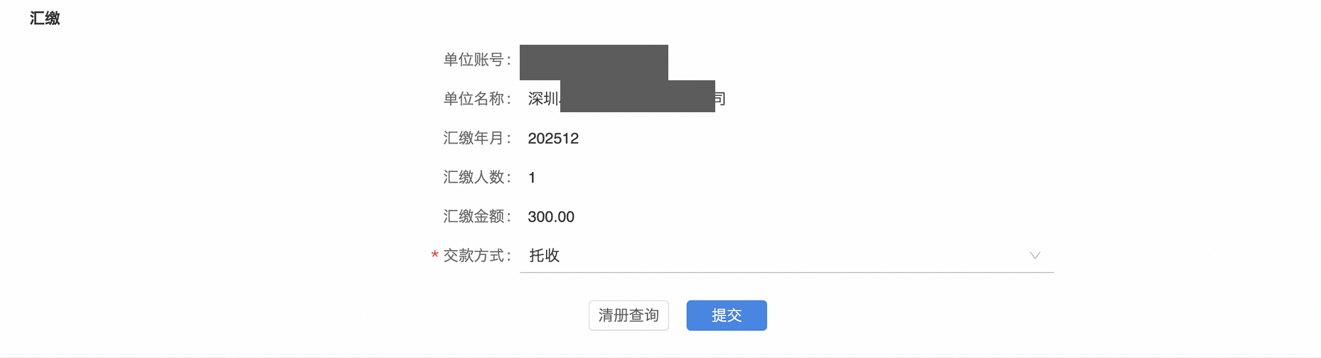 二、点击汇缴计算,计算出【汇缴人数】及【汇缴金额】,并选择【交款方式】。