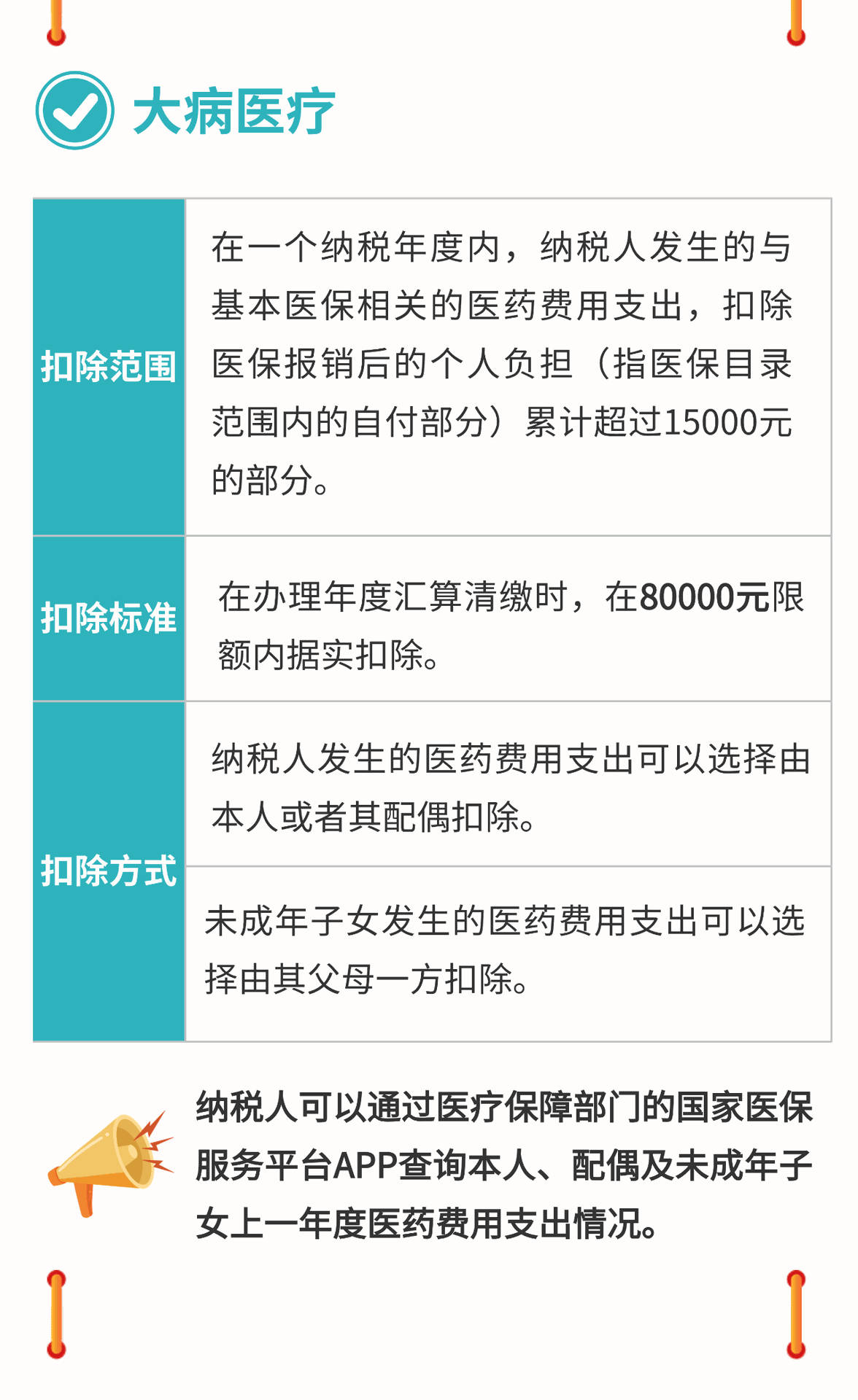 大病医疗:纳税人年末住院,第二年年初出院,以医疗费用结算单上的结算时间为准判断扣除所属年度。