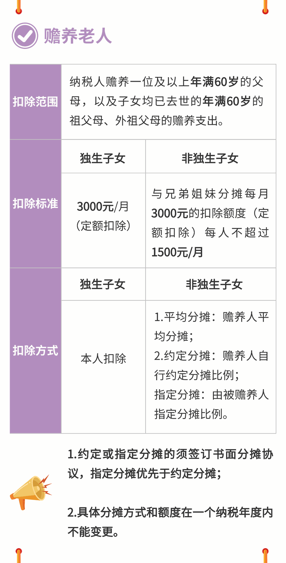 赡养老人:扣除额度与老人数量无关,固定每月 3000 元。